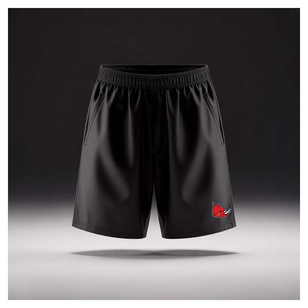 Elastic waistband, two side pockets with embroidered Rhino Head logo.